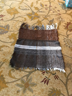 The cloth I wove with handspun singles as the warp and the weft is off the loom! These picture show it fresh off the loom before any washing or fulling. I used gelatin sizing on the singles. I ran out of sized singles at one point (about halfway through the weaving) and scoured my handspun stash for any singles I had. I finished the weaving with un-sized singles. You can see where that happened in the weaving as there is a sudden draw-in of the fabric. Next in the process will be fulling, which will also wash the yarn. I expect some of the whites to brighten up a bit. It measures about 120 x 24 inches pre-fulling.